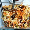 - Orzechy włoskie posiekać i lekko zrumienić na patelni. Żurawinę wsypać do miseczki, zalać wrzątkiem do przykrycia i odstawić na 5-10 minut, odcedzić. Orzechy i żurawinę dodać do surówki.