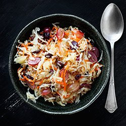 Surówka z białej kapusty, marchewki i jabłka, z dodatkiem zrumienionych orzechów włoskich, czerwonych bezpestkowych winogron i suszonej żurawiny. W wersji bez majonezu ale za to z oliwą extra vergine, miodem i sokiem z cytryny. Wyśmienita jako zdrowa przekąska lub dodatek do obiadu. Porcja witamin na talerzu, idealna na jesień, polecam do zrobienia jak najszybciej!
