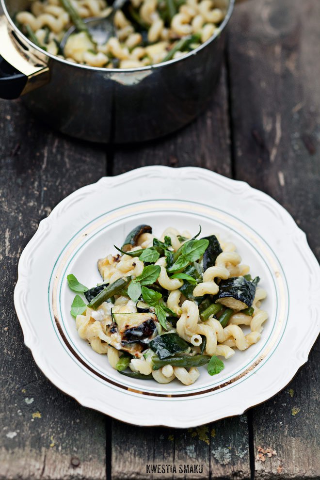 Makaron z warzywami to obowiązkowe danie na lato. Grillowana cukinia, dobrze ugotowana fasolka szparagowa i bazylia. Do tego sos powstały ze zmiksowanej części cukinii i kawałeczka sera koziego w roladce. Niewielka ilość oliwy extra vergine i świeżo zmielony czarny pieprz i pyszny aromatyczny sos jest gotowy! Bez dodatkowej śmietanki. Roladka kozia idealnie tutaj pasuje, ale możecie też dodać np. gorgonzoli. Aby danie było jeszcze szybsze do zrobienia, fasolkę gotujemy razem z makaronem.