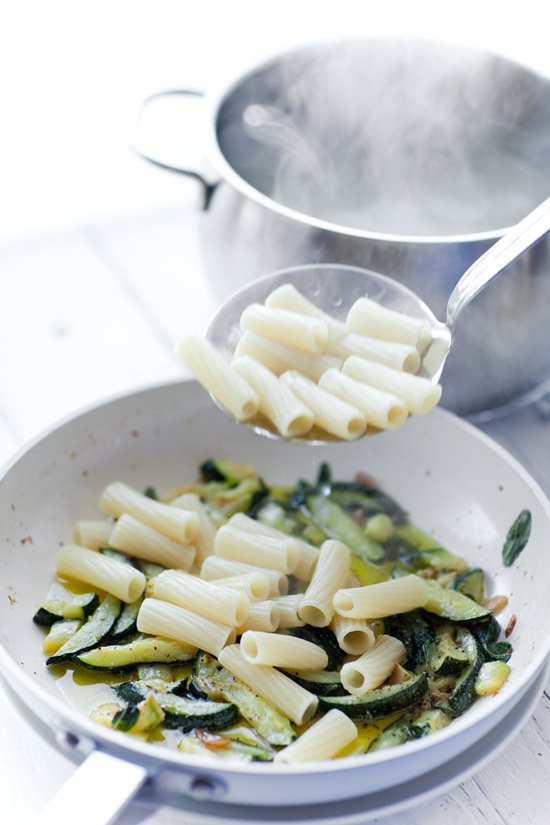 - Cukinię pokroić w 1 cm słupki o długości zbliżonej do makaronu. Na patelnię wlać oliwę extra vergine i dodać pokrojony na plasterki czosnek. Podgrzewać na średnim ogniu przez około 1 - 2 minuty, aż czosnek zacznie skwierczeć. Dodać cukinię, oprószyć solą i świeżo zmielonym czarnym pieprzem. Wymieszać i podsmażać przez około 1 - 2 minuty.
