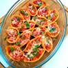 - Rozgrzać grill w piekarniku na wysoką moc, ewentualnie nagrzać piekarnik do 200 stopni. Farszem z papryki i pomidorów napełnić ugotowane muszle i ułożyć je w naczyniu żaroodpornym jedna obok drugiej. Skropić oliwą z oliwek extra virgin i posypać 4 - 5 łyżkami tartego Parmezanu. Wstawić do nagrzanego piekarnika i zapiekać przez około 10 minut lub do czasu aż ser się roztopi i lekko zrumieni.