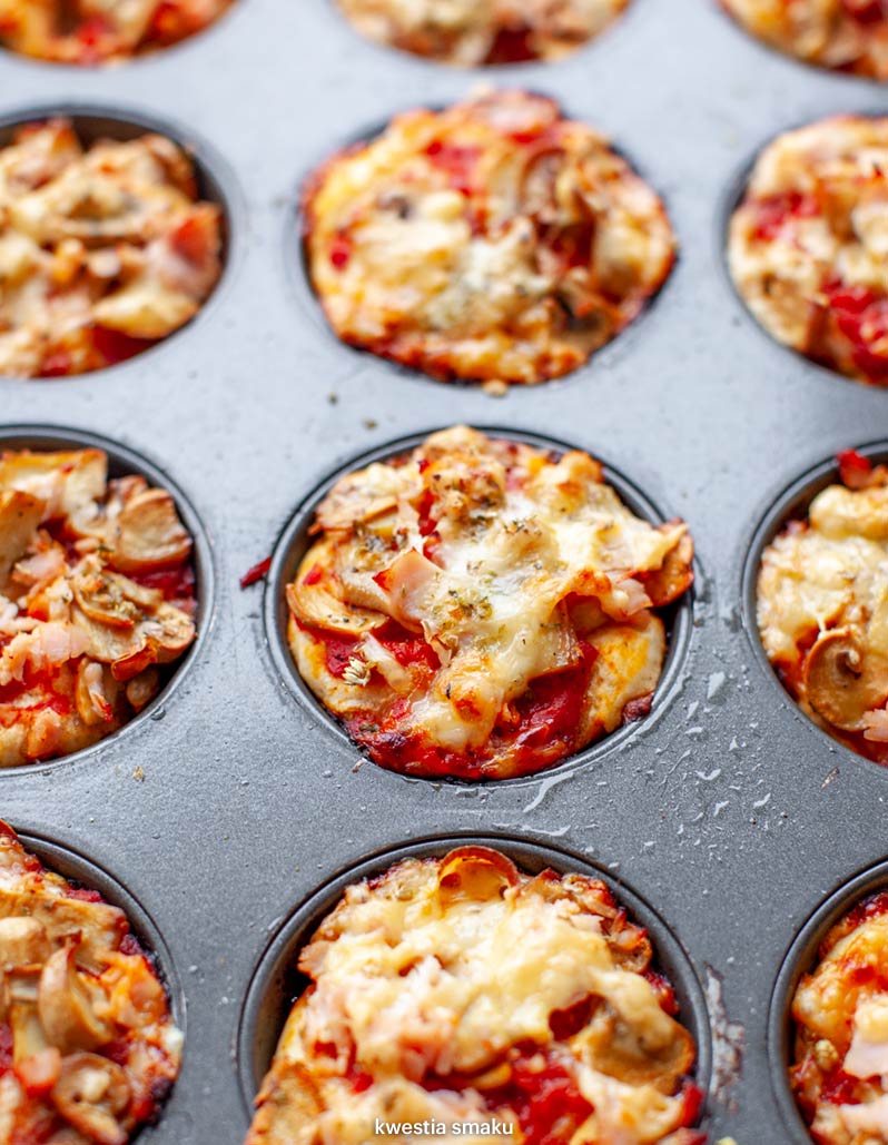 Mini pizzetki pieczone w formie na muffiny, można je zrobić z ulubionymi dodatkami. Lubiane przez dzieci i dorosłych, sprawdzą się na imprezie jak i na co dzień - na kolację - lub jako danie do szkoły czy pracy. Tak dla odmiany od tradycyjnej pizzy ;-)