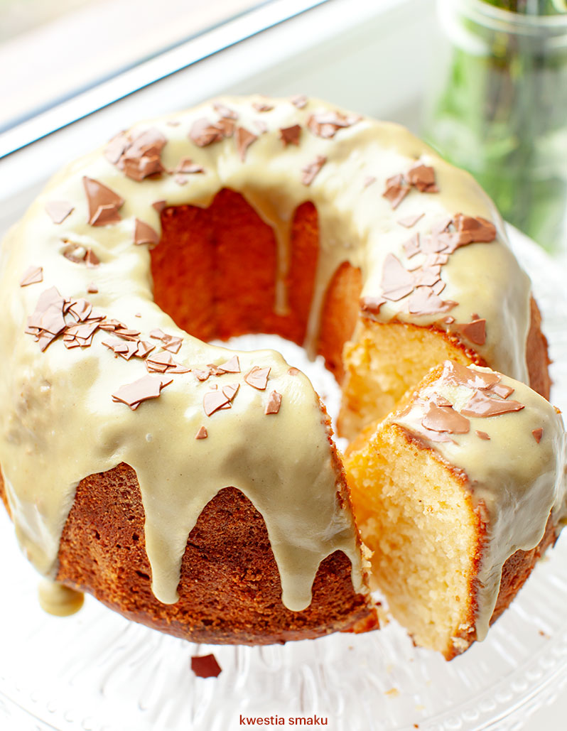 - Wyjąć formę z babką z piekarnika, ostudzić, wyłożyć na paterę i polać lukrem (zwykłym lub z dodatkiem pasty pistacjowej).