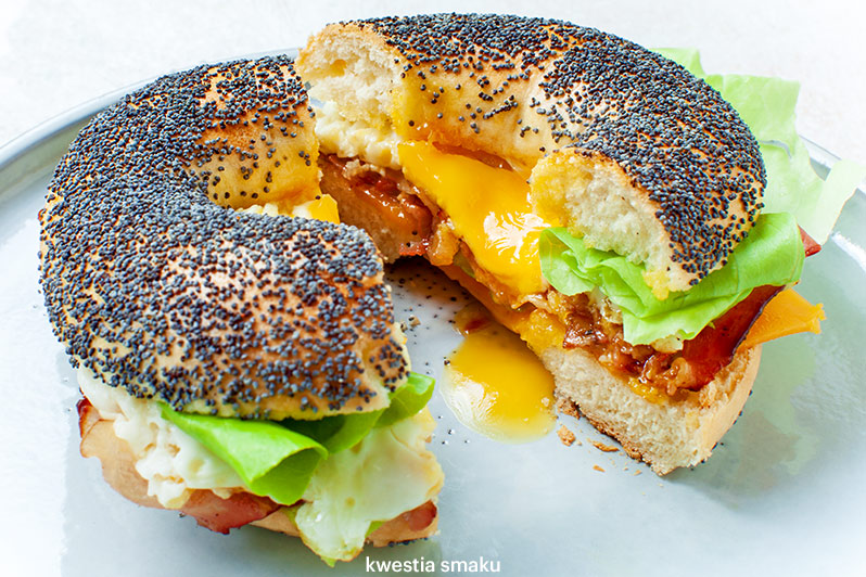 kwestiasmaku Bajgiel z boczkiem, sałatą, serem i jajkiem sadzonym