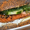 Najbardziej popularny ze wszystkich bajgli, słynny Lox. Z wędzonym łososiem, śmietankowym serkiem i świeżym ogórkiem. Z dodatków koniecznie koperek, szczypiorek. Dla chętnych kapary i plasterki rzodkiewki.