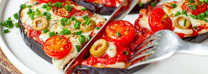 Plastry bakłażana wcześniej podpiekamy z oliwą i czosnkiem, potem nakładamy tradycyjne dodatki jak na pizzę czyli sos pomidorowy, szynkę i ser oraz plastreki oliwek. Pieczemy jeszcze trochę i gotowe!🍕