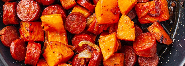 Danie inspirowane hiszpańskim tapas - Papas con chorizo, ale w wersji z batatami zamiast ziemniaków. Podawane w naczyniach żaroodpornych jako przekąska, lub w formie tortilli podgrzewanej z serem.