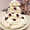 - Delikatnie podciąć nożem krążki bezowe i układać na paterze przekładając kremem (można ze szprycy), pralinkami i owocami.