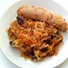 Biała kiełbasa pieczona w piwie z kiszoną kapustą