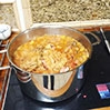 - Wlać 2 szklanki gorącego bulionu lub wody z solą i pieprzem, zagotować. Następnie dodać połamane suszone grzyby, przykryć, zmniejszyć ogień i gotować przez ok. 45 minut.