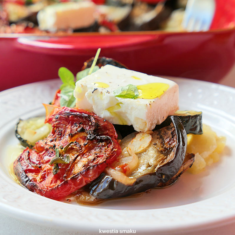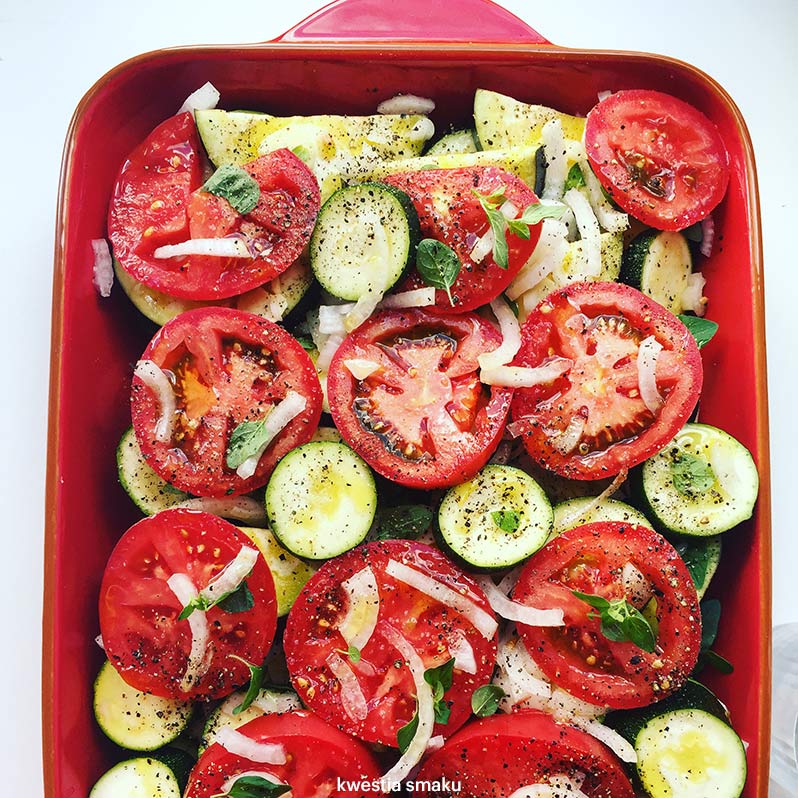 Na dno naczynia żaroodpornego układamy plasterki ziemniaków, następnie plasterki cukinii, cebuli, bakłażana i pomidorów. Dodajemy też czosnek, świeże oregano oraz oliwą. Przygotowanie jest proste a efekt naprawdę znakomity. Polecam do wypróbowania jako pomysł na wykorzystanie sezonowych warzyw!