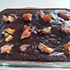 - Ciasto opcjonalnie polać polewą czekoladową: do miseczki włożyć połamaną na kosteczki czekoladę, wlać mleko i roztopić w mikrofali lub kąpieli wodnej, wymieszać do uzyskania gładkiej konsystencji. Polać po cieście i udekorować pokrojonymi daktylami.