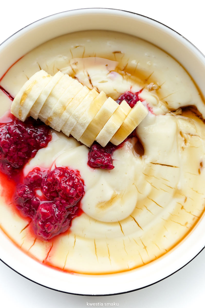- owoce, np: plasterki banana i maliny (świeże lub mrożone)