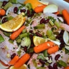 • Dodać umyte i pokrojone na ćwiartki pomarańcze, marchewki, odcedzoną na sitku i opłukaną fasolkę oraz seler naciowy pokrojony na 1/2 cm plasterki.