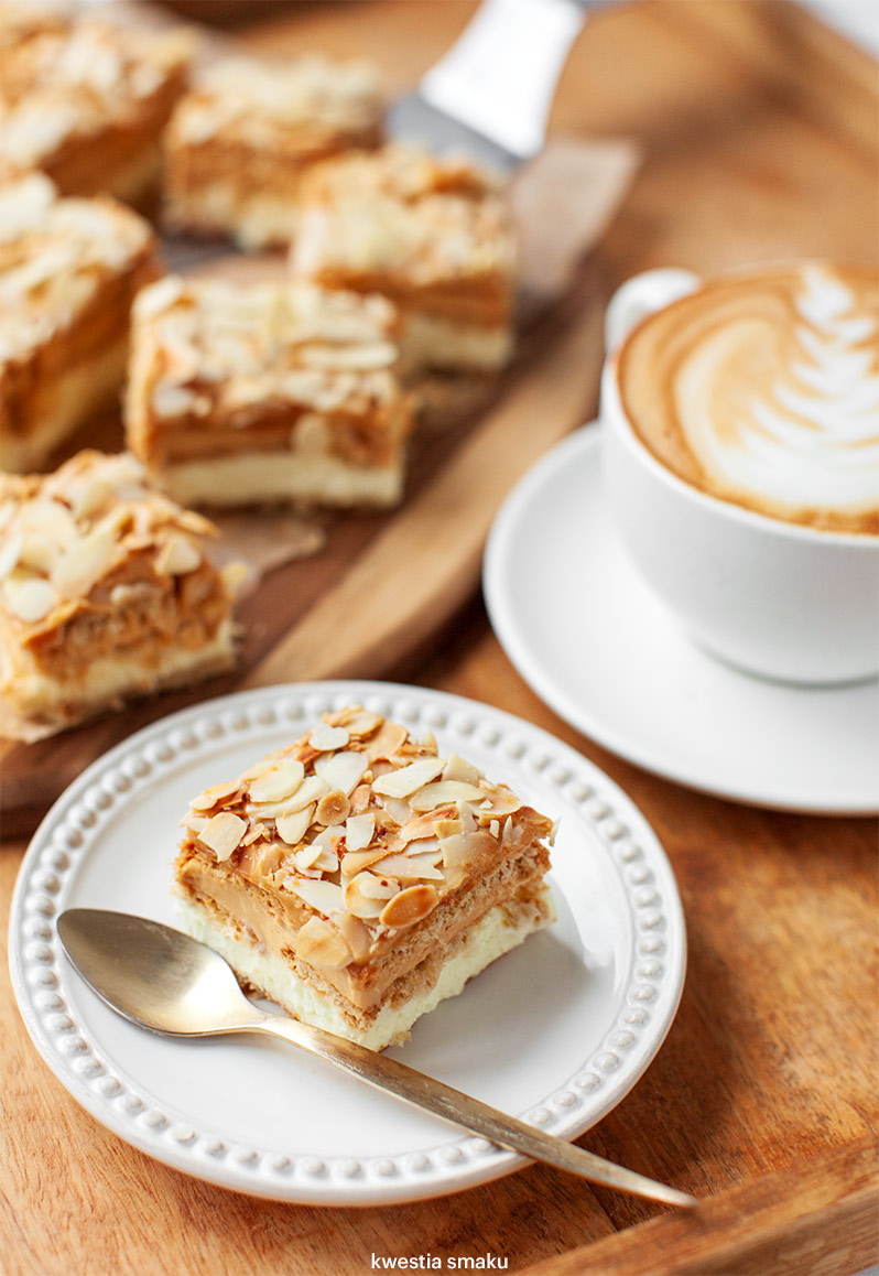 Pyszne, kajmakowe ciasto z masą budyniową w wersji bez pieczenia. To 3 warstwy kruchych krakersów, przełożonych kremową i śmietankową masą budyniową oraz masą kajmakową. Wierzch z podprażonych płatków migdałowych. Idealne przełamanie słodyczy ciasta lekko słonymi krakersami. Można też użyć zwykłych herbatników.