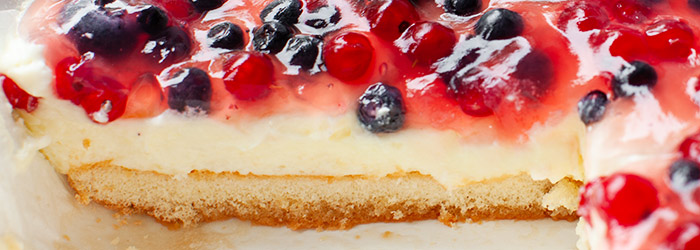 Ciasto na lato na biszkoptach, z kremem budyniowym z mascarpone oraz owocami w kisielu