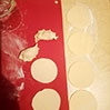 - Małą szklanką wycinać kółka, rozciągnąć je trochę w palcach, następnie na środek nakładać po jednej czubatej łyżeczce farszu.