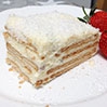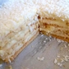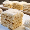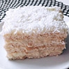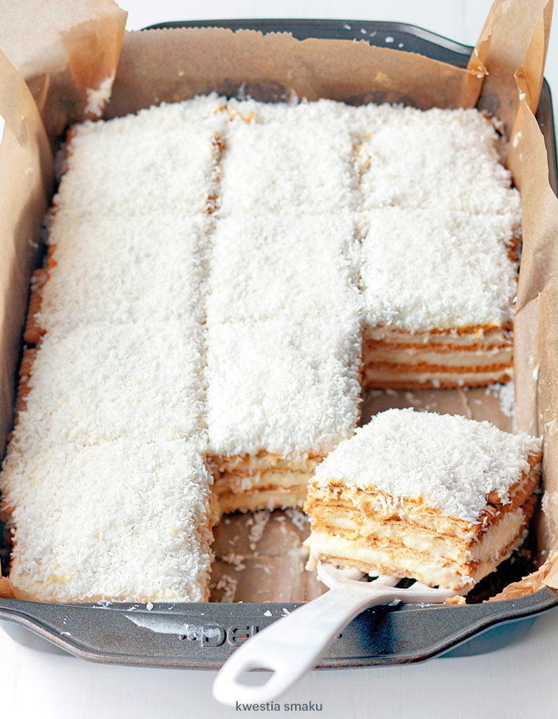 Cztery warstwy herbatników przełożone kremem budyniowym (z ugotowanego budyniu utartego z masłem), posypane wiórkami kokosowymi.