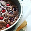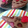 Wersja czekoladowa popularnego hiszpańskiego ciasta migdałowego Torta de Santiago, z dodatkiem malin.