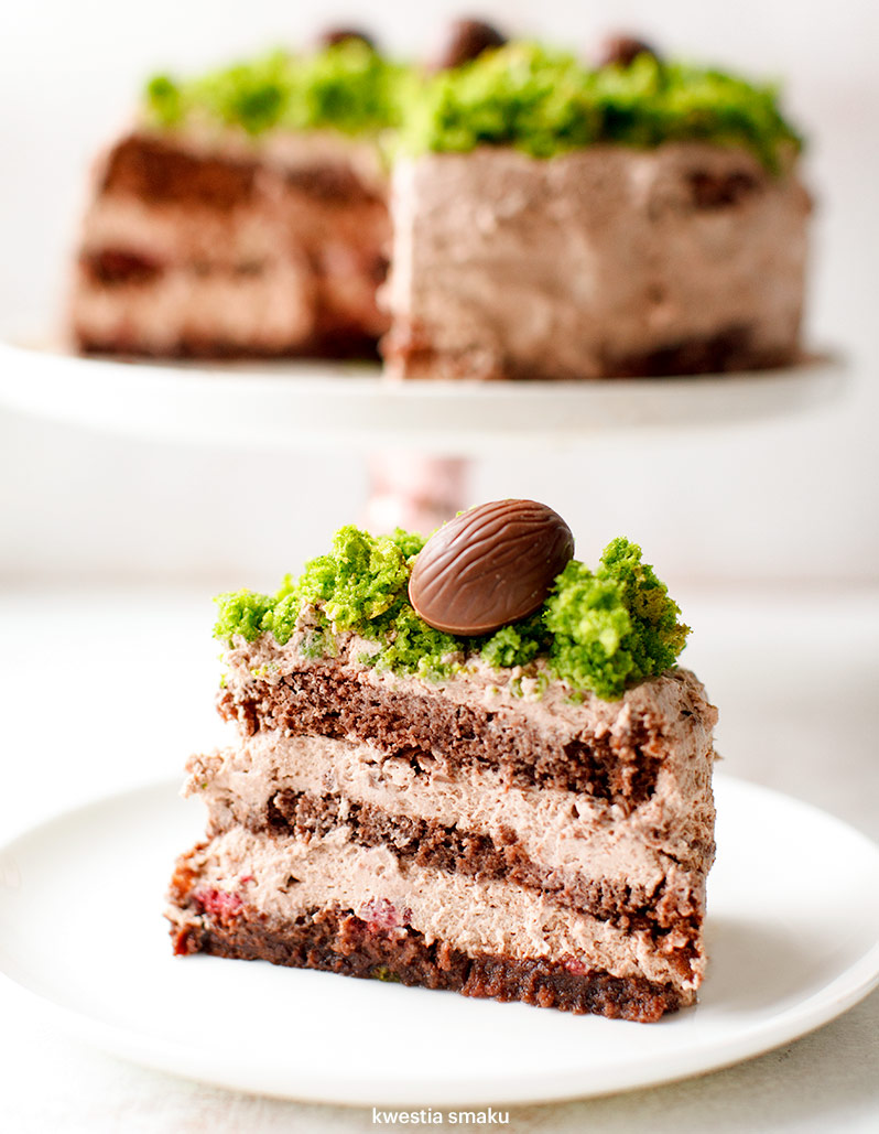 Puszyste czekoladowe biszkopty przełożone kakaowym kremem mascarpone, malinami i startą czekoladą. Wierzch udekorowany zielonym "mchem" i - na Wielkanoc - zanurzonymi w nim czekoladowymi jajeczkami. Prawdopodobnie jeszcze piękniej wyglądałby udekorowany dodatkowo małymi, świeżymi wiosennymi kwiatuszkami ;-) Po ilości składników może się wydawać, że tort jest skomplikowany do zrobienia, ale taki nie jest. Co najważniejsze - jest naprawdę pyszny! Wypróbujcie przepis i przekonajcie się sami :-)