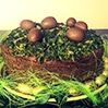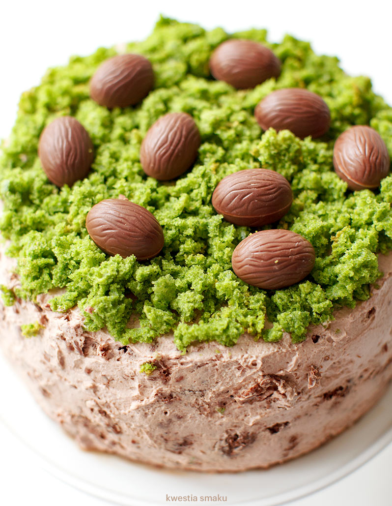 - Po wyjęciu z piekarnika zielone ciasto dokładnie ostudzić, następnie pokruszyć na wierzchu tortu (niekoniecznie całe ciasto trzeba wykorzystać). Ułożyć jajeczka czekoladowe i udekorować kwiatkami jeśli takie mamy.