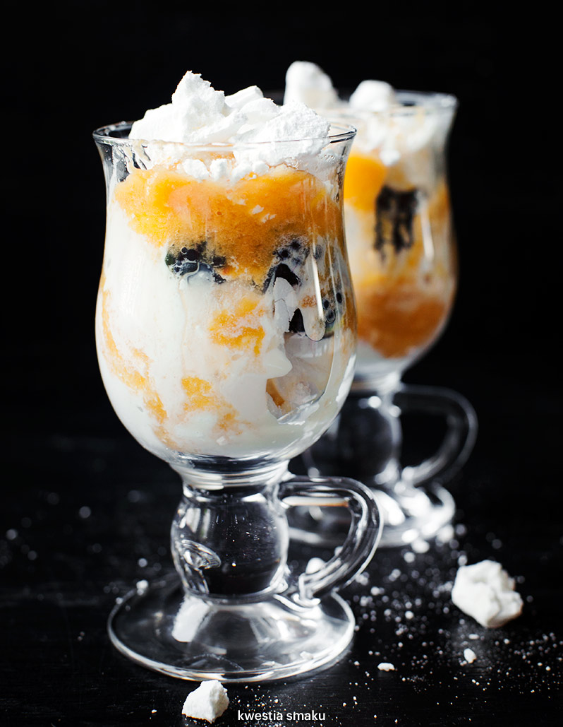 kwestiasmaku Deser w pucharkach z bezą, lodami, jeżynami i musem brzoskwiniowym