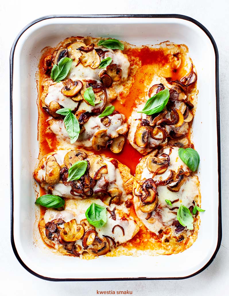 Danie, które można porównać do pizzetek, bo kurczak jest tutaj zapiekany podobnie jak pizza - z sosem pomidorowym, serem i pieczarkami. Dodatkowo z pyszną, podsmażaną czerwoną cebulą. Na koniec całość posypujemy świeżą bazylią. Do tak przygotowanego kurczaka pasuje makaron, np. pełnoziarnisty. Można go po ugotowaniu włożyć do naczynia z kurczakiem i delikatnie wymieszać z powstałym podczas pieczenia sokiem.