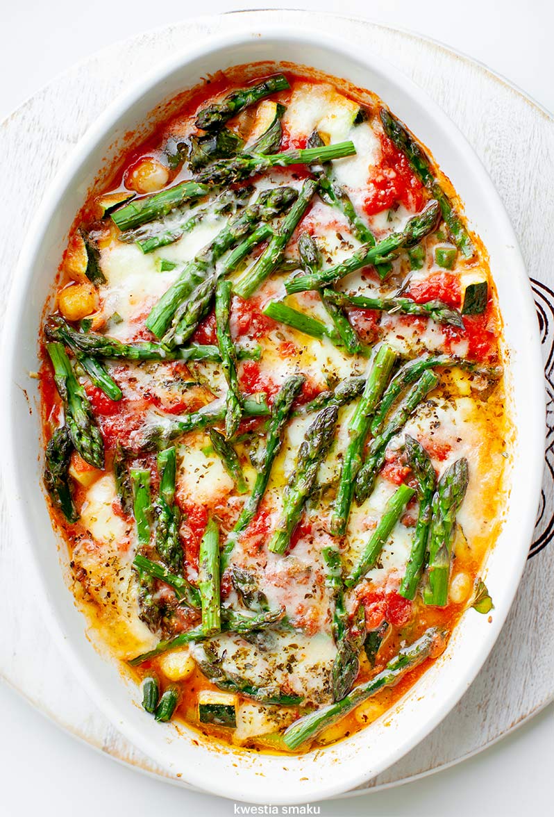 kwestiasmaku Gnocchi zapiekane ze szparagami w sosie pomidorowym z mozzarellą