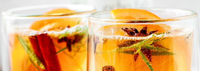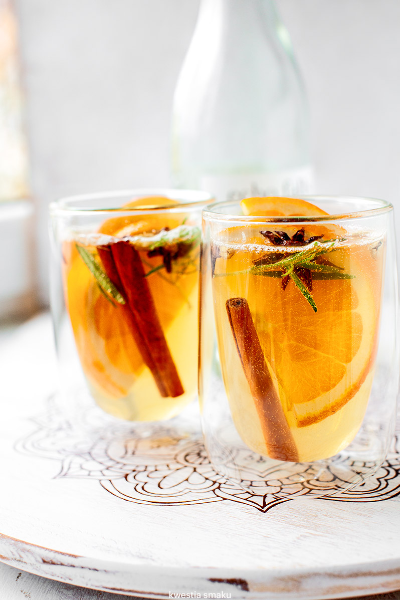 Grzaniec z białego wina z przyprawami korzennymi, z jabłkiem, pomarańczą i miodem