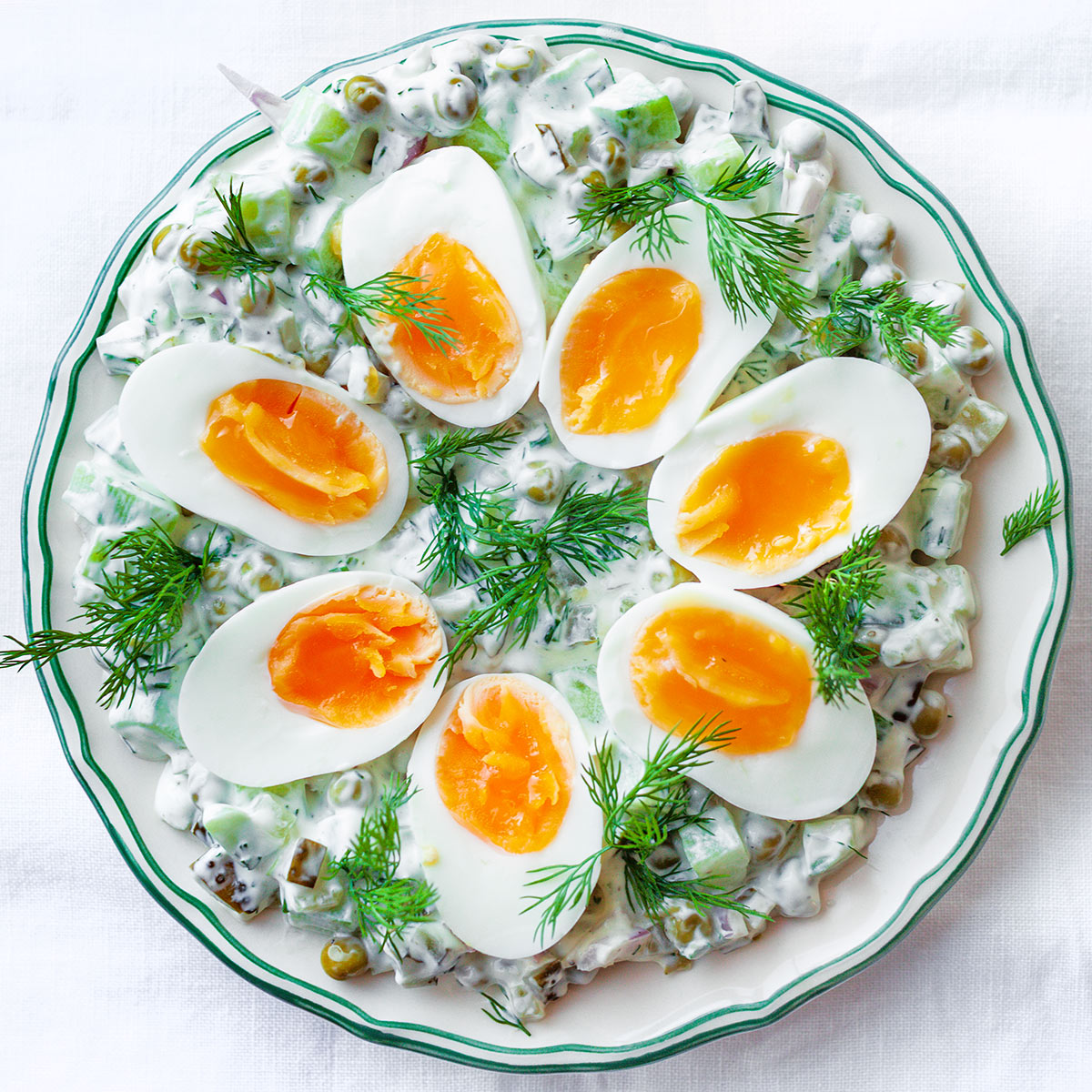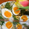 - Zrobić wgłębienia w otrzymanej sałatce i powkładać w nie połówki jajek. Miejscami dodać koperek.