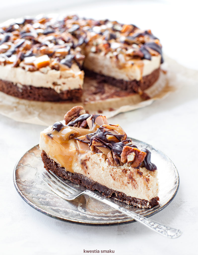 Pieczemy tylko sam spód brownie, reszta to już sernik na zimno a zatem bez pieczenia. Masa serowa to połączenie ubitego mascarpone, śmietanki oraz masy kajmakowej. Na wierzchu - pokrojone krówki i orzechy oraz polewa czekoladowa i kajmakowa. Wszystko proste do zrobienia i intuicyjne.