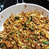- Kurczaka pokroić w małą kosteczkę, doprawić solą, grubo zmielonym pieprzem oraz suszonym oregano. Zdjąć pokrywę z patelni, przesunąć pora na bok, w wolne miejsce włożyć kurczaka i dokładnie go obsmażyć.