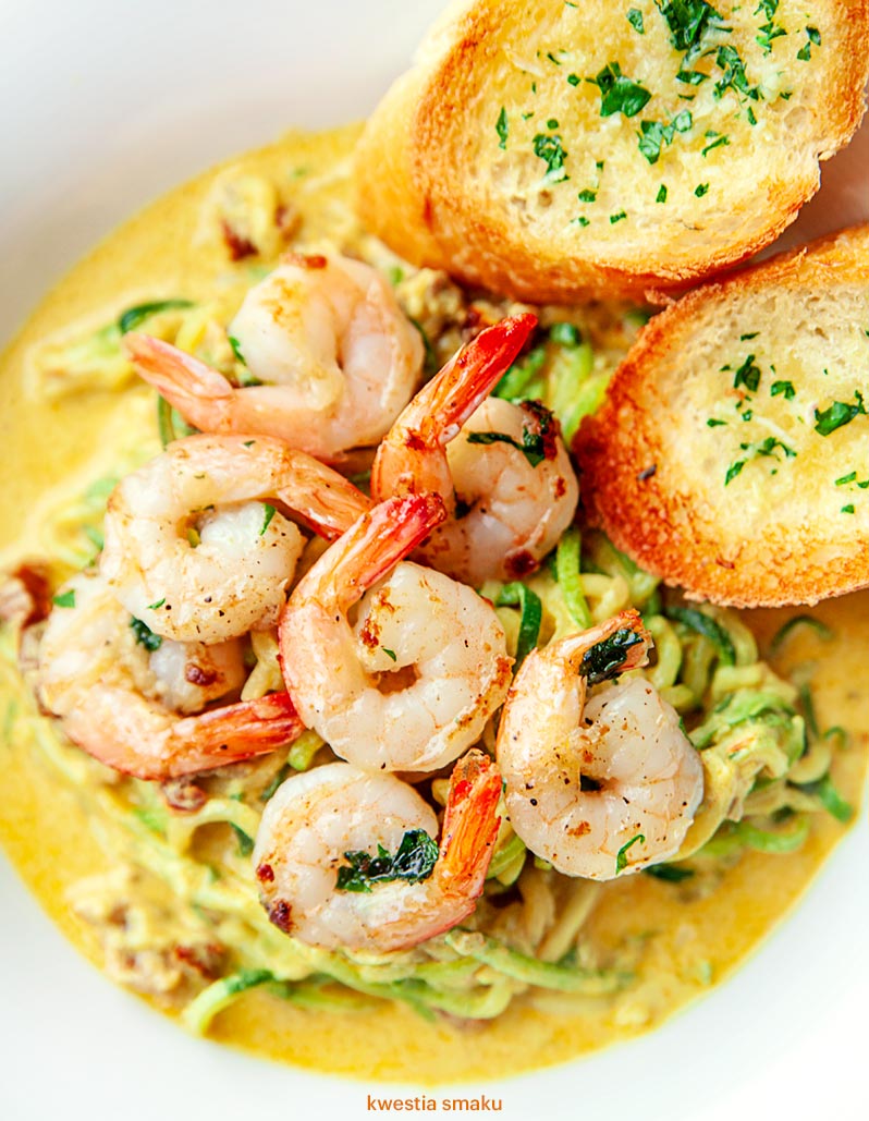 To smakowite danie to połączenie smażonych na oliwie krewetek z czosnkiem, spaghetti z cukinii oraz sosu curry na śmietance. Nie byłoby takie dobre gdyby nie dodatek pysznych czosnkowych grzanek z bagietki ;)
