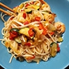 - W woku (lub na dużej patelni) na 1 łyżce oleju podsmażać przez 3 minuty marchewkę, paprykę oraz czosnek. Następnie dodać cukinię i smażyć często mieszając jeszcze przez ok. 5 minut, pod koniec dodać cebulę, imbir oraz doprawić warzywa solą i chili.