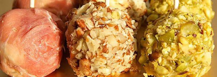 - Pistacje lub orzechy drobno posiekać i obtoczyć w nich ulepione kulki. Przed posiekaniem orzechy można uprażyć. W każdą kulkę wetknąć wykałaczkę i ułożyć na półmisku. Kulki można też oblepić szynką parmeńską.