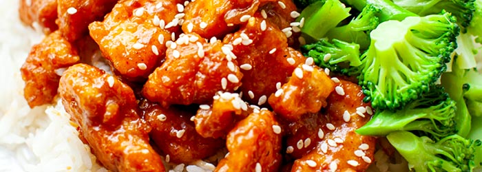 Kawałki soczystego kurczaka smażone w panierce, obtoczone w sosie hoisin z sosu sojowego, masła orzechowego i oleju sezamowego.