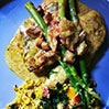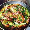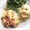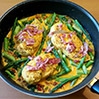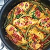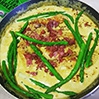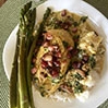 Posypany chrupiącą posypką z boczku lub bekonu, podawany ze szparagami. Zatopiony w kremowym sosie z dodatkiem suszonych pomidorów. Ciekawego posmaku dodaje kurkuma i papryka w proszku. Dzięki gotowaniu całych filetów na patelni, pozostają one bardzo soczyste w środku.