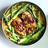 - Obłożyć szparagami, mięso posypać boczkiem i natką pietruszki.