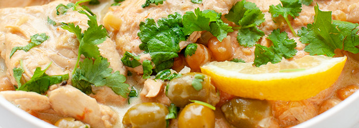 To szybkie do zrobienia danie z filetów kurczaka, z dodatkiem ciecierzycy oraz zielonych oliwek. Z przypraw charakterystycznych dla kuchni marokańskiej dodaje się świeży imbir, kmin rzymski oraz szafran a całe danie posypuje świeżą kolendrą. Jeśli jeszcze bardziej chcecie zbliżyć się do oryginalnej kuchni marokańskiej, możecie tutaj wykorzystać kiszone cytryny. W swojej domowej wersji skrapiam potrawę po prostu sokiem z cytryny.