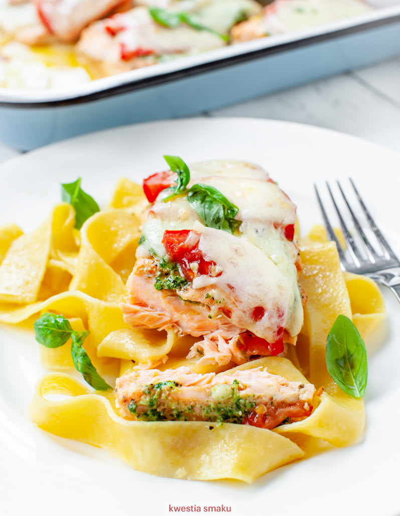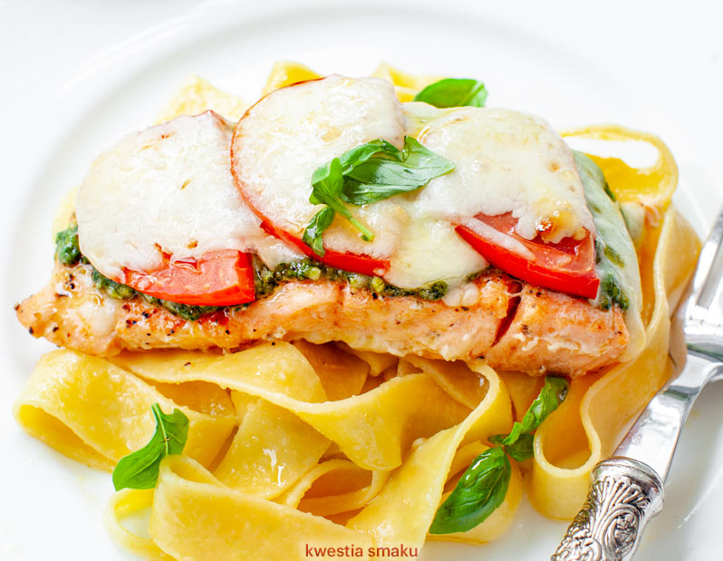 Banalne przygotowanie a efekt jak z restauracji! Możecie tym daniem przyjąć gości a przy tym za bardzo się nie napracujecie ;-) Sprawdzi się tutaj mozzarella (można kupić od razu startą lub w kawałku na wagę). Pesto można zrobić samemu (z bazylii, czosnku, orzechów i parmezanu) lub kupić gotowe w słoiczku. Polecam oczywiście domowe, przygotowanie jest proste: składniki wrzucamy do rozdrabniacza i chwilę miksujemy. Łososia można podać na makaronie (u mnie świeży makaron pappardelle), sprawdzi się też np. kasza bulgur czy ryż.