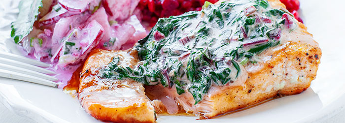 - Wysunąć łososia z piekarnika, na wierzchu wyłożyć botwinkę ze śmietanką i zapiekać przez pół minuty. Wyjąć i podawać z kaszotto i np. surówką z rzodkiewki.