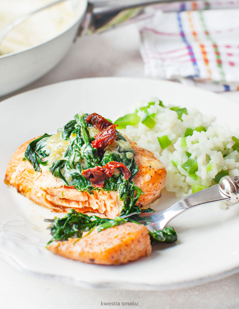 Zapiekane w piekarniku filety łososia z blanszowanym, kremowym szpinakiem i suszonymi pomidorami. Szybkie do zrobienia danie, które sprawdzi się zarówno jako codzienny obiad jak i danie dla gości. Wygląda efektownie, a smakuje jeszcze lepiej ;-)