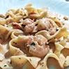 Pyszny makaron z krewetkami i pomidorkami w sosie śmietanowym z natką pietruszki.