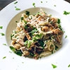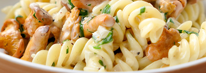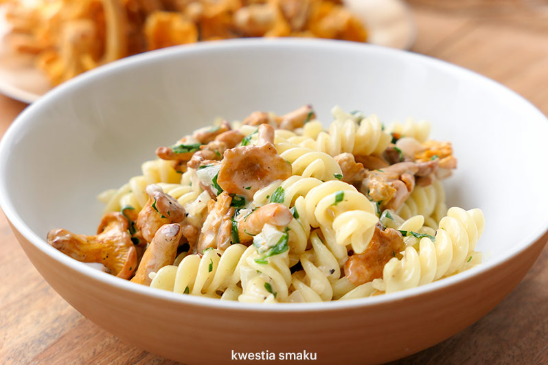 - Makaron ugotować al dente w osolonej wodzie. Kurki umyć i osuszyć, większe pokroić na mniejsze kawałki.
