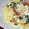 - Dodać odcedzony makaron, wymieszać i zagotować. Jeśli sos nie jest jeszcze gęsty gotować potrawę jeszcze przez chwilę ciągle mieszając, aż sos zgęstnieje.