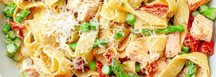 Makaron z łososiem, szparagami i suszonymi pomidorami