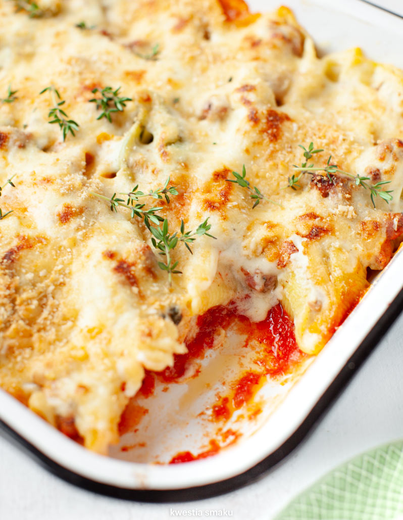 - W międzyczasie nałożyć do muszli mięsne nadzienie. Ułożyć na podgrzanym sosie pomidorowym, łyżką nalać sos beszamelowy.
