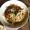 Makaron chow mein z warzywami (porem, papryką, cukinią i bakłażanem) i sosem w stylu koreańskim.