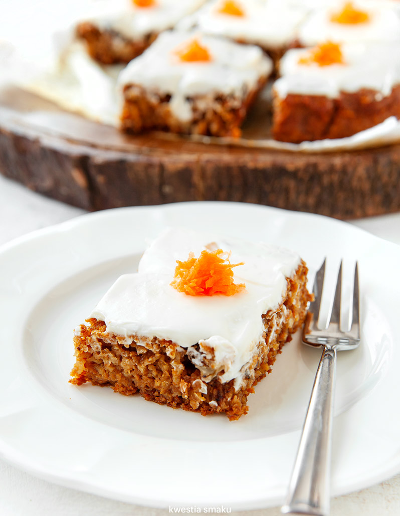 Placek posmarowałam polewą z serka Philadelphia, tak samo posłodzonego odrobiną miodu. Polewa nie jest konieczna, ale bez niej placek nie będzie przypominał słynnego ciasta marchewkowego ;)