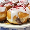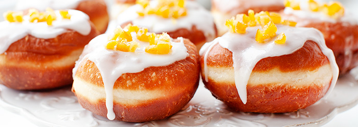 - Nadziewać marmoladą, udekorować lukrem i skórką pomarańczową lub posypać cukrem pudrem.